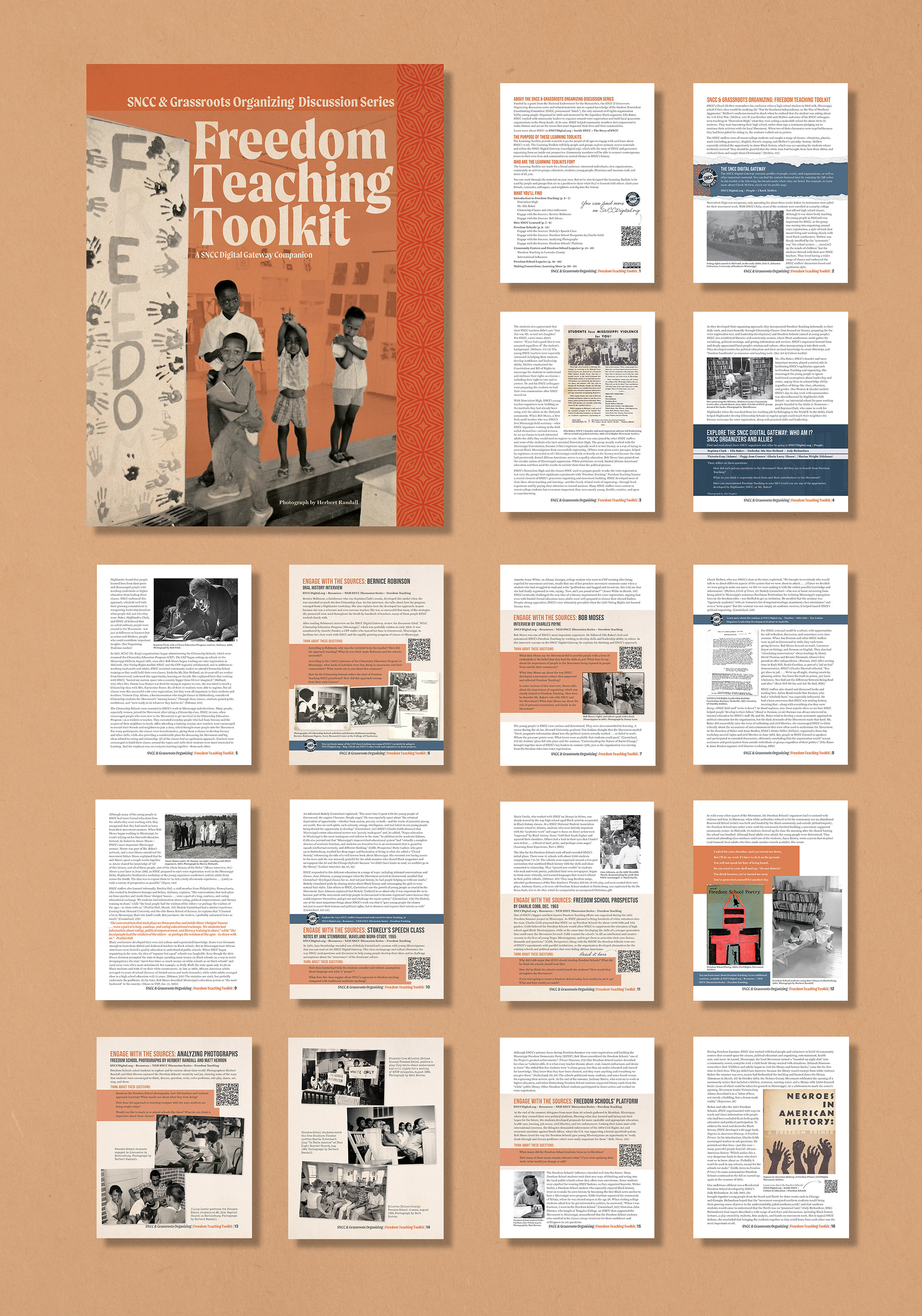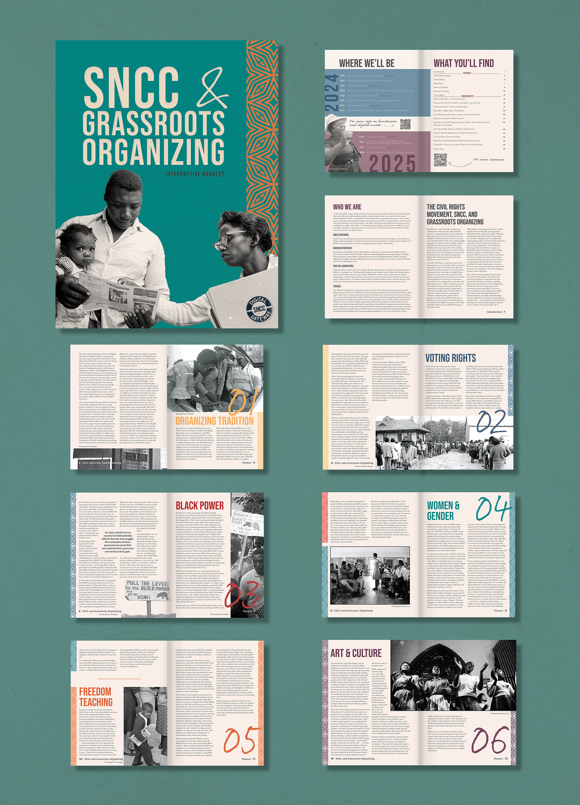 The SNCC & Grassroots Organizing Interpretive Booklet is a 56-page document that weaves together primary sources, historical narrative, and interactive activities across six themes that are at the heart of SNCC's story: the organizing tradition, voting rights, Black Power, women and gender, freedom teaching, and art and culture in movement building. To make the document easier to follow, I assigned a different color to each theme and incorporated visual cues to help the reader see the network of connections at play. Six learning toolkits were then developed to accompany this booklet, each focused on one of the themes. Below you will find selected pages from these documents. Follow the link to see them in full.